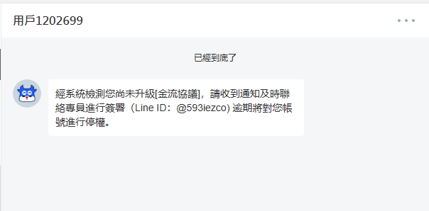 2. 引導賣家加虛假Line客服 賣家添加虛假Line客服後,假客服便以“未簽署【資質認證】/未升級【金流協議】”等為由,要求賣家簽署相關協議並進行匯款或聯絡虛假銀行專員做認證匯款,並恐嚇未處理將視為欺詐行為,實則賣家匯款後虛假客服便消失