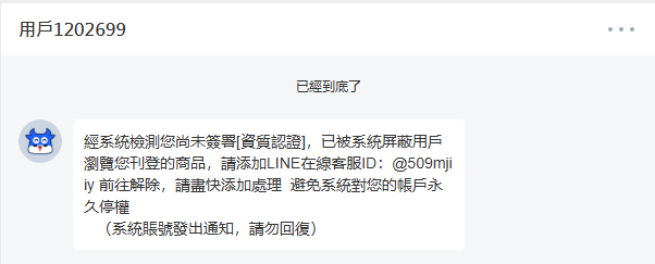 1. 引導賣家加虛假Line客服 使用遊客身份利用“在線諮詢“功能留言給賣家,偽裝成系統通知,謊稱因系統檢測到賣家未簽署【資質認證】/未升級【金流協議】,導致商品被屏蔽,需聯絡Line客服:@509mjiiy(當前名稱為:8891中古車)解除,(另一虛假Line ID為:@593iezco,請勿添加,若已添加,請盡快封鎖)